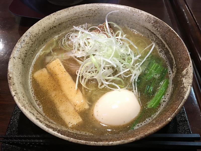 そんな中いただいたのがこちらの品。香味油と魚粉がプラスされているのですが、ベースが当然ながら塩味ということでそれらの風味がわりとストレートに来る印象で、中でも魚粉の効きが凄いですね。なので、非常に美味しいんですけど、ベースのラーメンが良いだけにどことなしか勿体ない感があるのは贅沢な悩みでしょうか。また麺は、チュルポニョシコっとした口当たりと食感で、スープとの相性も申し分なし。そして藻塩で焼き上げたというチャーシューは香ばしく、追加の味玉は、絶妙な火の通し加減と味加減です。