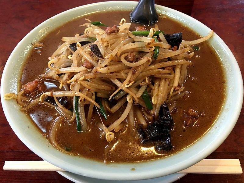 それがこちら。赤っぽい色が独特なビジュアルなのですが、早速スープからいただいてみると、ベースは中華料理店らしい清湯スープでしょうか?ですがそこに、豆味噌の渋みや、味噌ダレに野菜を漬け熟成させた事によるひねたような風味、そして具となる炒めた挽肉や野菜の旨味が加わって、まろやかな中にも複雑な味わいを醸し出しています。また麺は、結構細めの縮れタイプで、最初はハリがあるけど、伸びるまでの時間は短い気もしました。そして具は、前述のとおりモヤシやニラ、キクラゲなどの野菜と挽肉を炒めたもので、量的にもたっぷりあって食べ応えが。