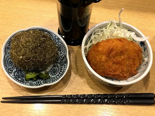 それでいただいたのが、こちらのセット。まずは黒醤油ラーメンですが、名前のとおり、見た目からして黒々としています。で、早速スープからいってみたところ、動物系メインの澄んだスープの旨味に、醤油っ気、そして塩気がガツンと。ですが、以前発祥のお店の支店でいただいた時に感じた「らしい」塩辛さというよりも、しょっぱいけど個人的には十分許容範囲というか、ちゃんと味わって飲める濃さで、ブラックペッパーも控えめに感じます。また麺は、中太の縮れ麺で、わりと硬質な歯応えという印象。その食感や醤油色に染まっているところから、加水率は低めでしょうか。そして具は、トロトロのチャーシューが良い感じで、他にメンマ、そしてたっぷりの白ネギが富山ブラックらしいです。あとセットのコロッケととろろ昆布おにぎりは間違いがない味なのですが、個人的には、このラーメンだと(塩気はやや抑えめだといえども)やっぱり白米が欲しくなるなぁ、と。