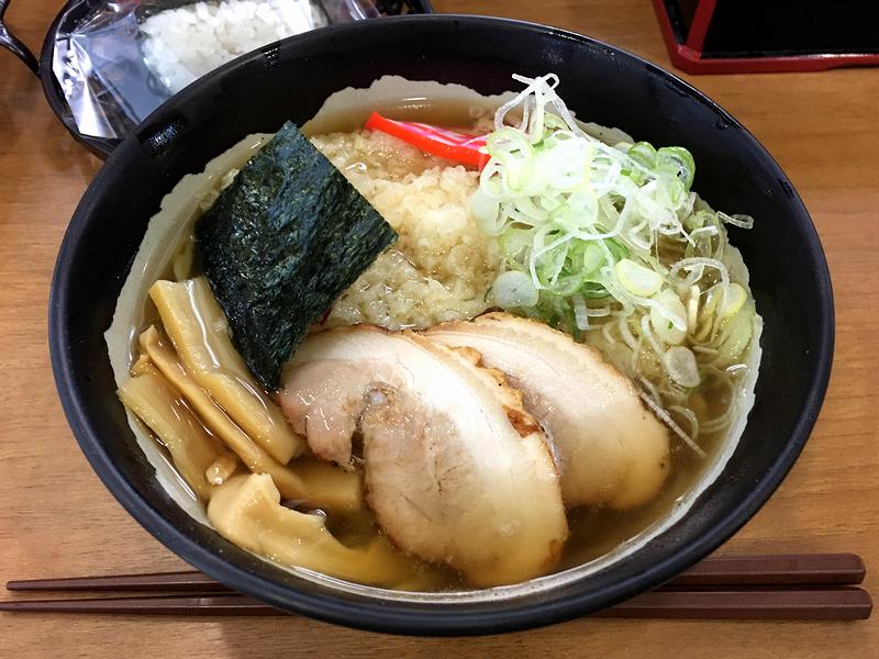 その品がこの天ぷらラーメン。個人的には、立ち食いそば・うどん店や定食屋さんで何度か見かけたことがある品で、その場合、具がネギと天ぷらくらいの廉価品的扱いだった記憶があるのですが、こちらのは通常のラーメンに、更に天ぷらをプラスといった構成になっています。で、早速スープからいただくと、当然ながら鰹ダシが香るそばつゆではなく、あっさり系の醤油ラーメンスープの味が。ちなみに、元々のラーメンのお値段が450円なので、それを考えれば十分なお味ですね。また麺は、若干細めのストレートタイプ。特段何かあるわけではないのですが、悪くないです。それと具は、柔らかいチャーシューが2枚に、メンマや白ネギもたっぷり。赤巻蒲鉾が当地らしさを盛り上げます。そして天ぷらは、当地というか西日本の立ち食い店でよくある、小ぶりのエビを真に衣を巨大化させたもの。スープや麺との相性は悪くないというか、油っ気が足されこれはこれで良い感じです。