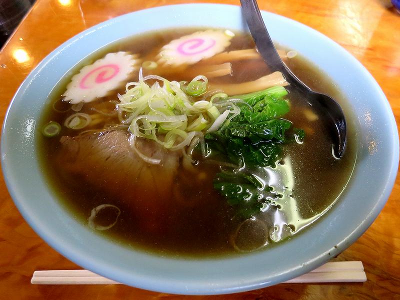 それで今回は、初めてということで、一番左上に書かれたしょうゆラーメンをいってみることに。ちなみに、このメニューに限って大盛りは無料となっていましたが、今回は普通盛りでお願いしました。で、程なくして登場したラーメンですが、見た目からしてとってもベーシック。その印象は、スープに口を付けても変わらず、特に凝ったところは感じないものの、必要十分というか。そして麺は、結構細めのストレートタイプ。ハリやコシなどもちゃんとしていて、悪くないですね。