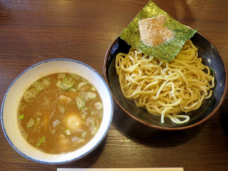 それで今回いただいたのが、こちらでは初めてとなるつけ麺なのですが、冷・温選べる麺は、暖かい方でお願いしました。で、登場して早速、麺をつけ汁に浸けていただいてみたところ、豚骨というか家系ベースのつけ汁は、結構甘味が効いている印象。また、角切りチャーシューやメンマなどの具はつけ汁の中に入っていたのですが、そういえばメンマって、こちらのお店で初めていただいたかも。そして途中から麺のところに添えられた魚粉を投入すれば、これは間違いの無いお味。スープ割りの有無は訊かなかったのですが、麺を食べ終わった後は、残ったつけ汁にライスをインすれば、丁度良い感じになりました。で、残しておいた半熟味玉と共にいただいて〆。