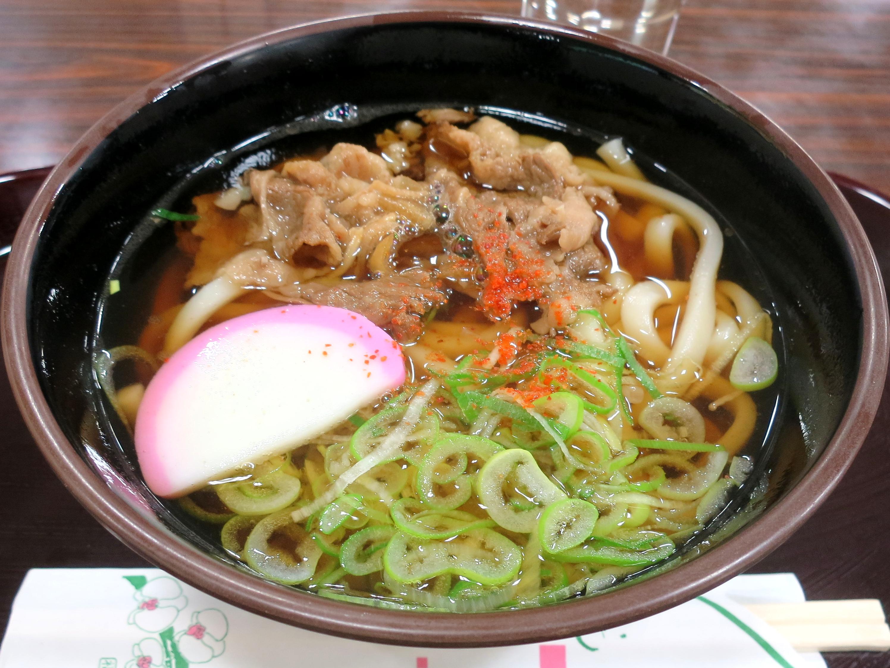 それでいただくは当然肉うどんなのですが、関ヶ原を超えて岐阜県に入ったにもかかわらず、「近江牛」を冠した品名になっていました。ただ、岐阜県に入ったためか、つゆは薄口醤油ではなく濃い口醤油の効いた味付け。塩気は十分ですが、ダシ感はあまり感じないタイプです。またうどんは、ごく普通というか、それなりに歯応えが強調された冷凍ものという感じだったのですが、もし違っていたら申し訳ない。そしてメインの近江牛ですが、薄切りかつタマネギと一緒に煮込まれたもので、量的には大ぶりのものがいくつか。風味的に変に牛牛していないところが逆に近江牛という感じで味付けは悪くなかったです。