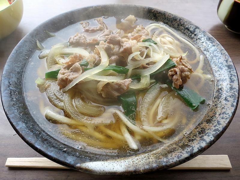 で、その岡林食堂さんでもう1品いただいたのが、高知までの道中以来、何故が妙に食べたくて仕方が無くなっている肉うどん。ですが、登場してちょっと驚いたのがその見た目。てっきり、素うどんの上に牛肉を煮たものものが出てくると思ったのですが、どうやらつゆと一緒に、豚肉?とタマネギ、そして緑色のは最初ニラだと思ったのですが、じつは青ネギを一緒に煮込んだものでした。もっとも、このスタイルの肉うどんは決して馴染みのないものではなく、昭和の最後の頃、約1年ほど大阪に住んでいた時、昼飯に通っていた立ち食いうどん屋さんの肉うどんがこのスタイルだったなぁ、と。なので、肉とネギ類の旨味がプラスされたつゆは美味しいのが最初からわかっているし、実際に味わってみても期待を裏切らなかったのですが、このうどんのつゆも、前の記事のラーメンと同じく、ベースの出汁から、決して嫌じゃないけどちょっと馴染みのない風味と旨味を感じるというか。また、かなり細めのうどんは、コシはあるけどふわっと柔らかい優しい食感。やわ麺好きなのでこれは嬉しいです。