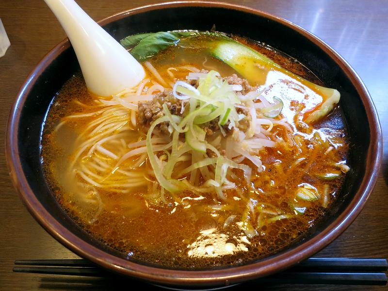 で、いただいたのが、らぁめん系メニューの筆頭に書かれていたこの担担麺。卓上に置いてあった「担担麺の美味しい食べ方」に従い、最初は全体を混ぜずにいただいたみたところ、ゴマの風味とラー油の辛さで担担麺の片鱗は見せますが、それらがアクセントになったあっさり系のラーメンという印象。ただ、あっさりしていながらも滋味深いスープ(何と無化調とのこと!)や、細身ながら密度感とコシ、ハリのある麺それぞれの、自力の高さは感じられますね。そして半分ほどいただいたあと、前述の「美味しい食べ方」に従い、今度は全体をよく混ぜていただいてみたところ、丼の底に仕込まれている練りゴマのコク、ラー油からと思われる一層の辛味に加え、スパイシー感や更には酸味まで感じる華やかかつ複雑な味が展開。ですが、ゴマで過剰にクリーミーにならず、後口はさっぱりし続けているのがまた良いですね。