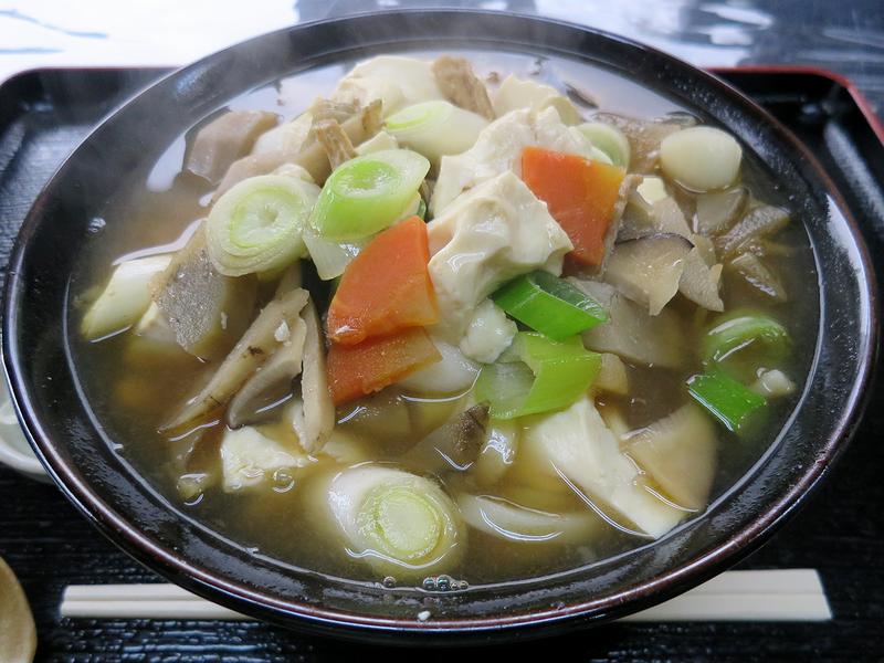 それでいただいたのが、お品書きに「特別メニュー」と書かれていたこちら。しかも12~3月限定の品だそうで。で、注文からちょっとだけ待って登場したそれは、丼から野菜や豆腐が小山になっていて、見るからにボリューミーです。なので最初は、具材をかき分けウドンを啜ったのですが、これが、小麦粉と塩が練り合わさった味がちゃんとするというか。適度なコシやツルツル感もある、なんていうか、真っ当なうどんという感じがとても良いです。またけんちんは、しっかりと味が染みた根菜類とナス、そしてしいたけ、油揚げを煮たベースに、絹ごし豆腐とネギを投入して仕上げたものでしょうか?醤油ベースの味付けと思われたのですが、濃すぎずさりとて薄すぎず、何とも良い塩梅。ほんと、ほっこりする味というか、この日は天気が悪く肌寒かったので尚更そう感じました。