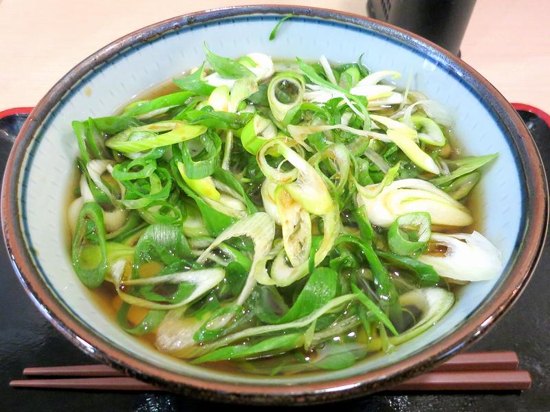 それで私がいただいたのが、こちらの品。ちなみにきざみうどんというのは、関東では見慣れないメニューなのですが、関西では一般的な、細長く刻んだ油揚げ(お揚げさん)が入っているうどんで、きつねうどんのように油揚げに味付け(甘じょっぱく煮るなど)はしないのが特徴でしょうか。で、写真でも判るとおり、そこにこれでもかと笹切りにされた九条ネギが入っているのですが、切ったものをただ入れただけではないらしく、色的にタレ(つゆのカエシ?)っぽいものを纏っているように見えるところも。そのお陰か、最後までシャキシャキの食感が残りつつ全体との馴染みも悪くない感じがしますね。それと、このうどんで個人的にもう一つ特徴的だと思ったのが、つゆに濃い口醤油の風味をわりと感じたこと。関西圏のつゆというと、関東圏のつゆのように醤油っ気は感じないものが多いのですが、こちらのは違うなぁ、と。それがこの品だけなのか、このPAだけなのか、それともこのPAがある滋賀県草津市だけなのかはわからないのですが。もっとも、それはそれで全くもって悪くないんですがね。