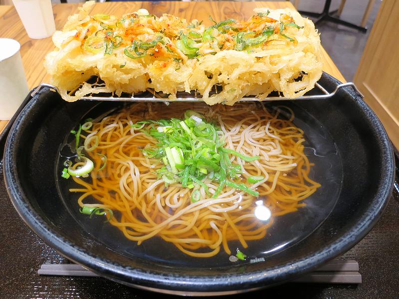 というわけでいただくのはこちらの品なのですが、写真でも判るとおり、かき揚げの大きさが、もの凄いですね。お品書きの写真ではやや大きいくらいのサイズに見えたので安心していたのですが、先客がカウンターで受け取ったそばを見て驚愕。でもその時は、「きっとあれは大盛りとか特別な品なんだ」と思おうとしたのですが、次に自分が呼ばれていざ対面した品は、その凶悪なまでに大きいかき揚げが付いたそれだったという。なので珍しく同行者に助けを求め、一杯のかけそばならぬ一杯のかきあげそばと相成ったのですが、その巨大なかき揚げは、桜エビよりもタマネギがメインな構成比。ですが、揚げたてでアツアツのサクサク。フードコートのカスターセットには塩などの調味料が見当たらなかったので、適宜箸で取ってそばのつゆに浸けていただけば、つゆの味付けがとてもしっかりしていることもあって、これがなかなかのお味。実は、これだけ巨大なかき揚げを目にした時、「つゆが薄味だったらつらい戦いになるな」などと思ったのですが、それは全く杞憂でした。また細めな蕎麦も、この手のところでいただくものにしてはと言ったら失礼なのですが、ちゃんとしていて良かったです。で、途中から残ったかき揚げをつゆに投入。それでも負けないつゆの味が頼もしいのですが、さすがにこれだけの大きさのかき揚げが全て経由すると、表面にはかなりの油が浮いてしまいました。