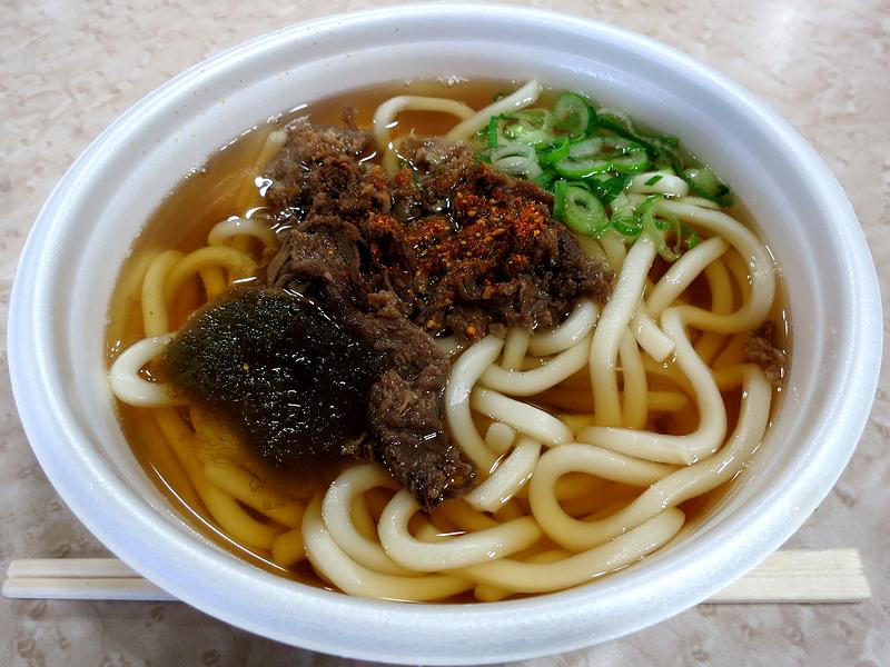それでいただいたのが、個人的に関西というか西日本に来るといただきたくなる肉うどん。まずはつゆですが、味付けは薄すぎず濃すぎず甘からずという感じで。また、ダシ感はこの手のお店らしくあまり無いのですが、デフォルトで入るとろろ昆布がそれを補っていますね。そしてうどんは、どちらかというと柔らかめなのですが、全体的にクタッと頼りないという感じではなく、押しつぶしていくと、ある一点でプツッと切れるような食感。あと、具の肉は結構細かいのがそれなりに入っていました。