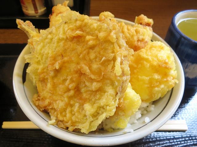 こちらは、一緒にいただいたもの。この時はものすごくお腹かが空いていたので、天丼用のご飯の上に、自分で好きな天ぷら載せてたらこんなことになってしまいました。あと、こちらで天丼(用ごはん)は初めていただいたのですが、ご飯を注文した時に一緒に出してくれる天丼用タレは、かなり甘味が強い味付けですね。単体とか、通常のうどんと一緒だと丁度良いと思うのですが、前述のとおり今回のうどんが甘かったので、甘甘々という感じになってしまったというか。
