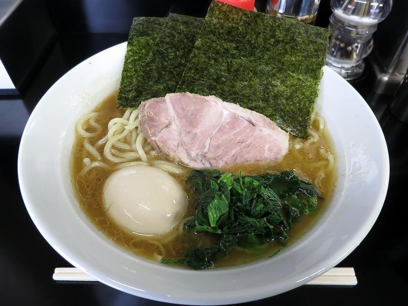 食券提出時に(ライスの食券を含めて)「全部普通で」とお願いし、目の前で作られていく様を見ているとあっという間に登場したそのラーメン。スープの赤っぽい見た目(写真だと上手く写ってないのですが…。)からして、豚ガラをかなり炊き込んだように感じたのですが、まずはそのスープからいってみたところ、ガツンっ!と、豚の旨味と醤油の塩気がハードヒットという感じ。のっけからインパクト十分ですね。ただ、豚のエキス分というかダシ成分は濃いものの、後味は意外とキレが良いというか、いつまでも口の中が脂でベタッとしないところにこのスープの特徴を感じます。また、勢いで中盛りにしてしまった麺は、特注の中太玉子麺ということで、いただいてみると「プリっ」を硬質にしたような、堅いけど弾力も感じる食感。断面が家系でお馴染みの若干平たいものではなく、元々スクエアなのがパンパンに張った感じということで、最初は正直家系っぽくない感じがしたものの、いただいているうちにこれはこれで大いにアリかと思いました。そして具のチャーシューは、適度に脂の抜けたホロッとした食感のもので、味染みも十分。ほうれん草もたっぷり入っています。あと味玉は、黄身がトロトロのタイプで、こちらも味付けは結構濃い目に感じました。で、このラーメンと共に、ライスをいただけば、もう。ちなみにライスは、最初はそのまま、2口目から豆板醤を投入して、そしてスープをレンゲで1杯。あとは、海苔でくるんだり、チャーシューや味玉とともにいただいたりと堪能しまくったのですが、やっぱり、家系はライスがとても合いますね。