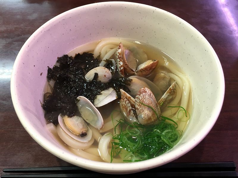 なぜこの品かというと、これまでこちらのお店で何度かうどんをいただいているにもかかわらず、いつもたぬきうどんだったのでたまには違う物をという理由だったんですが、結論から言うと、もっと早く食べておくべきでした。色の薄い=醤油が主張しないつゆは、あさりの風味や旨味が結構感じられ、味加減の良さと相まってこれがなかなか。ちなみに数えたところ、あさりは8個入っていました。そこに、海苔の風味が程良く加わって、トータルで結構旨いかもしれません。