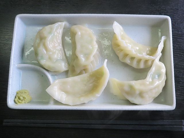 こちらは、一緒にいただいたもの。確か水餃子は初めてだったと思うのですが、「お酢と混ぜてください」という柚子胡椒が添えられているんですね。で、そのとおり、適宜お酢で伸ばしてから付けていただいてみたところ、これがまた。ジューシーな餃子そのものにちゃんと味が付いていてそれだけでも良い感じなのですが、そこにお酢と柚子胡椒が良いアクセントになって、サッパリツルっと。しかもこの柚子胡椒。一般的な物と違ってワサビのような風味がしてとても爽やかです。それにしても、もっと早くにいただいておくべきでしたね。