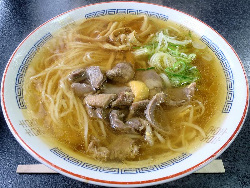 実はこの新庄に来た目的というのが、当地のごく一部のお店で何十年も前から食されてきたという、鶏モツラーメン。煮て味付けした鶏モツをラーメンに載せていただくというスタイルで、最近は街おこしのために利用され、色々なお店でいただけるようになっているのですが、今回は折角なので、その元祖を謳う一こちらの茶庵支店にお伺いしてみることに。ちなみに、新庄市内には一茶庵支店の他に、一茶庵本店と一茶庵分店もあるのですが、鶏モツ入りのラーメンで有名なのは支店のほうで、本店はモツは載らずとも(っていうか、鶏モツの載ったラーメンは無いそうで)昔ながらの中華そばが有名だそうです。