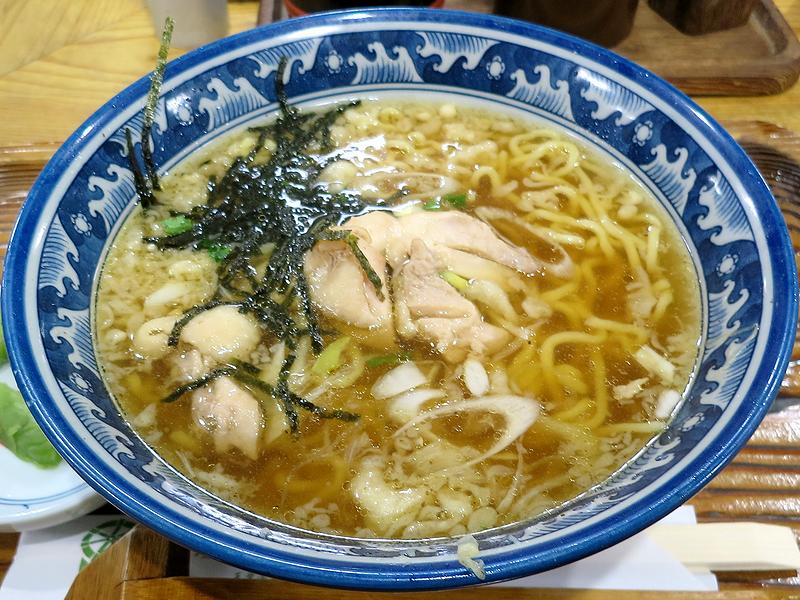 そんな中いただいた元祖の鳥中華。つゆは蕎麦つゆっぽいというか、かえしの醤油とみりん的味付けでしょうか?また、鶏の出汁感はそれほど主張しないという印象ですが、天かすが実に効いているというか、後述する中華麺とそばつゆの間を上手く取り持ってくれているような気が。また、海苔や白ネギの香りで最初は気付きづらかったのですが、最初から胡椒が効かされていますね。(もっとも、卓上には一味唐辛子しか置いてないので、後から追加しようにも出来ないのですが。)また麺は、(昔からの品=細縮れ麺という思い込みがあったので)以外に感じた太めの縮れ麺で、最初はツルツルっというよりも若干ゴワっとした口当たりなのですが、いただいているうちに意外と柔らか目な噛み心地になっていったというか。そして具は、歯応えのある鶏肉がゴロゴロと。それにしても、麺もつゆもボリューミーというか、つゆまで飲み干せば、お腹いっぱいになりました。