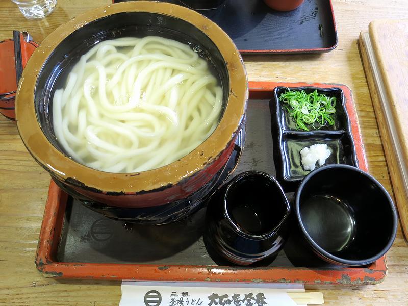 そんな中いただいたのが、「絶対のお薦め!」というこちら。釜揚げうどんの起源には諸説あるのですが、こちらのお店は大正時代初めまで茹でて水洗いしてから食べられていたものを、先代の店主が「これでは温かいうどんが食べられない」と茹で釜から取って直接食べたことから「元祖」を謳っています。ちなみに「中盛り」は、こちらのお店だと普通盛りの事を指すようです。と、前置きが長くなりましたが、こちらの釜揚げうどん。ウドンそのものは、ふっと香る小麦の香りとモチモチっとした食感が良いですね。またつゆは、塩気、醤油っ気のやや立った味のバランスが、個人的に好み。釜揚げうどんってものすごくシンプルな品ですが、これをいただくと必要にして十分と思います。