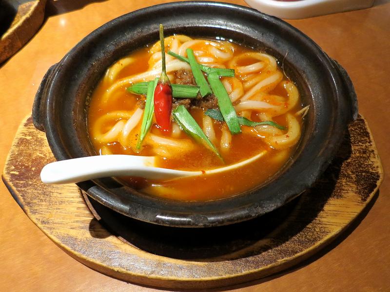 で、色々と飲み食いした後、〆にいただいたのがこちらの品。図らずも、今日のご飯は三食ともうどんになってしまったのですが、その中で一番安かったりするんですよね。それで「燃える辛さに挑戦ダァーッ!」(確かお品書きにそんな言葉が書かれていたかと)ということで挑戦してみたのですが、(辛い物が結構好きな)個人的には十分許容範囲内。甘じょっぱくて辛味のある、チゲというか、そんな感じの味付けのつゆが、酔っ払った舌でも明確に味がわかります。また辛味が食欲を進ませ、もともと〆用なので量はさほど無いんですが、あっという間に完食した挙げ句、残った汁にご飯投入したくなってしまいました。(これまで大量に飲み食いしていたため自重しましたが。)
