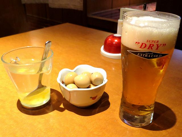 【左】ホットゆず茶 280円(税別)、【中】うずら玉子醤油煮 280円(税別)、【右】アサヒスーパードライエクストラコールド 550円(税別)