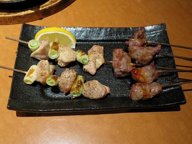 【左】鶏ねぎま串(塩) 1本180円(税別)、【右】熟成牛カルビ串(タレ) 480円(税別)