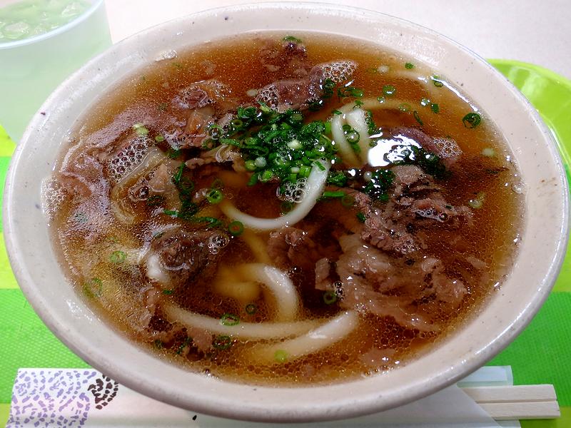 そこでいただいたのが、こちらの品。写真だと色が濃く写ってしまったつゆですが、実際にはもっと色が薄く、ラウス昆布、本かつお、地場いりこを使用しているというだしの風味と、いい感じの味加減がとってもグッド。またウドンはゆで麺ですが、当地らしく柔らかめなのが、個人的にはモロ好みな食感。それと具のお肉ですが、国産牛肉を使用しているとのこと。で、小倉名物のドギドギうどんに使われているドギ肉(頬肉)、スジ肉ではなく、多分一般的な部位だと思う(でも少々スジ肉っぽかった)ですが、その脂が味にコクを与えています。あとお肉と一緒に煮てあるタマネギの風味が結構主張するのですが、それはそれで合っていますね。