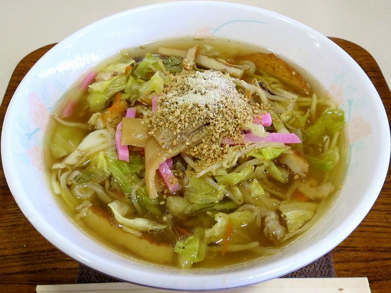 それで早速スープから一口いただけば、味付けは醤油ベースでしょうか?でもその風味は主張せず、全体的には、甘味を感じるとっても優しい味付けで、だからといって塩加減が物足りないなんてことはありません。そこに、お店のお姉さんがかけてくれる(筈なんですが、お姉さんが急に目の前からいなくなってしまったので自分でかけた)すりゴマがアクセントになって、何とも良いですね。(お願いすればたっぷりとかけてくれるらしいです。)また、味的にはあっさり目なのですが、ちゃんぽん麺や、たっぷりの具材と相まって、食べ応えはかなりのものです。ちなみにその具材は野菜のほか、丸天など練り物も多く入っているのが特徴的。あとは小エビと肉も入っていました。