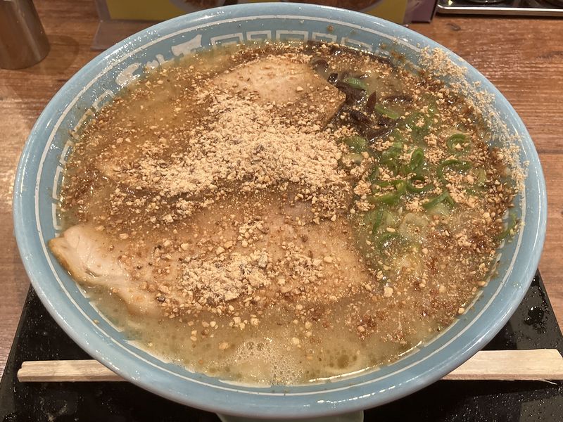 それで程なくして登場したそのラーメン。見た目的には、表面に振りかけられた粉状のものが印象的です。