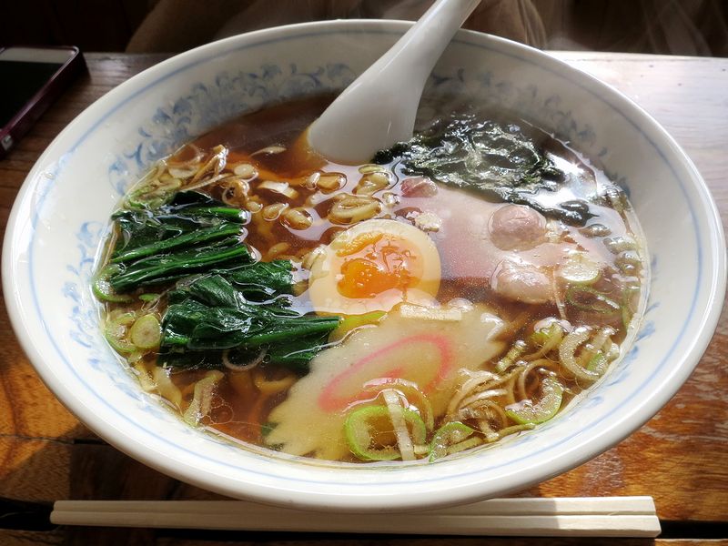 それでいただいたのは、こちらの品。麺の上に鎮座する、唐辛子とラー油?で和えられた「ねぎからし」が特徴的というか、実はこちらのお店を知ったきっかけだっりします。で、まずはそのねぎからしが混ざらないよう、そっとスープを一口啜れば、とてもスッキリしてゴクゴク飲めんでも大丈夫なくらいなのですが、それだけではなく旨味も十分ありますね。また、麺はピロピロというかチリチリとした食感の、縮れの入った平たいもの。俗に白河ラーメンと呼ばれる一般的にものとは違う印象を受けましたが、これはこれで良い感じです。そして、スモーキーな風味もありつつホロっと柔らかい肩ロース?のチャーシューが、個人的には大ヒット。チャーシュー増量して良かったです。それとワンタンは、紙のような薄さの皮が印象的。他の具も、半熟の卵の安心感や、ホウレン草とナルトの懐かし感が良いですね。あと、ねぎからしは、効き出すとハッキリ辛く結構なパンチ力が。麺と絡めていただいてもオツでした。