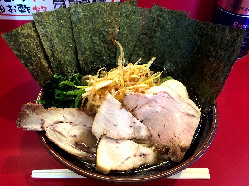 食券提出時、家系らしく麺の固さ・油の量・味の濃さを尋ねられたのですが、最初なので全部普通でお願いして待つこと少々。ちなみに、提供されてからも味は調整可能とのことです。それで登場したラーメンは、各種具材でまさしく満艦飾といった感じ。早速スープからいただけば、お味はコットテリとした脂感と、ちょっとワイルドなところを含めた豚骨感がかなり感じられます。ただし、醤油色が濃い見た目どおり、デフォルトでも味は濃いめというか、塩気はちょっと強目。もっとも、このテのラーメンは、ある程度しょっぱくないと美味しく感じられないと思いますが。また太めの麺は、家系を名乗るとあって製麺所がどこか気になるところですが、実際にいただいてみるとモチモチっとした食感が旨く、スープとの相性も良いですね。そして、具のチャーシューは脂身が結構多めに感じられたものの、悪くない印象。家系らしいホウレン草やピリっとしたネギ、とても良く合う海苔もいいですね。あと味玉は、半熟の黄身がネットリ系で、薄めの味付けは濃い味付けのスープに合っているという印象、それと、ライスは(おかわり無料でしたが1杯に留めた)ラーメンと合うというか、特に豆板醤を混ぜると、脂の多いスープに殊更合うんですよね。