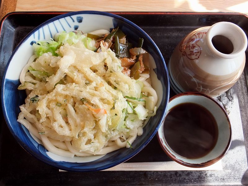 そんな中いただいたのが、こちらの品。実は壁に貼られたものを含めお品書きに書かれた品数が大変多くて迷ったのですが、なんとなくこれで。やがて登場したうどんは、丼にうどん、そしてその上にかき揚げというスタイルは私の地元でもなじみのあるものですが、それに加えて茹でキャベツやネギと油揚の煮た物が一緒に載るのは珍しく感じました。それで早速、徳利から蕎麦猪口に暖かいつゆを注ぎ、これまた暖かいうどんを浸けていただくと、これがチュルフワっと軽い食感がして、うどん自体の味も軽快で、これならいくらでも食べられますね。またつゆは、つけつゆだけあってわりと濃いめで塩気が立った味加減ですが、その背後にはダシ的旨味も結構感じられます。それとかき揚げは野菜メインで揚げたてではないように感じましたが、個人的に一番気にするつゆとの馴染みは悪くなく、味にコクをプラスしてくれます。あとネギと油揚げの煮た物はうどんと一緒に食べると間違いの無い相性ですし、茹でキャベツは味や食感がアクセントになって面白かったです。