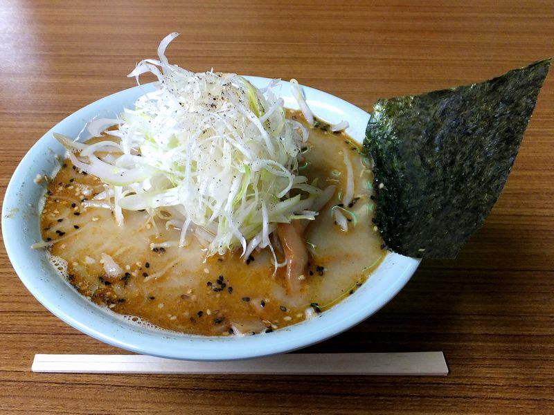 それでいただいたのがこちらの品。まずはスープを一口啜れば、味噌は白味噌メインですかね?そのまろやかな味噌味の中に、節粉のパンチが効いた味わい。またそのおかげで味にしっかりとキャラクターが出来ているというか。そして麺は、やや縮れた中くらいの太さのもので、モチっとした食感です。それと具は、柔らかいけど肉の歯応え・食感を残したチャーシューとの他、もやしとメンマ。あとネギラーメンのネギは笹切りしてさらしたタイプでした。