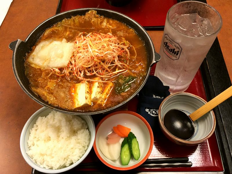 それで今回いただいたのがこちら。ばんどう太郎さんといえばみそ煮込みうどんが定番だったりするのですが、この日は妙に寒かったせいか、「激辛」「ネギ」という単語に激しく惹かれたもので。それでお味のほうですが、「みそ煮込み」と言っても名古屋名物の味噌煮込みうどんほど(塩)辛くない(あれはあれで好きですけど。)ものの、わりと濃いめの味加減ですが、そこ加わる出汁、味噌、そしてたっぷり入る様々な具材から出た旨味とコクが良い感じ。また「激辛」と言っても、(個人的な感覚では)結構辛いですが十分に味わえる(ただし汗は出ますが)辛さで、上に載る辛ネギのピリっと感を含めて丁度良かったです。それとうどんは、ツルツルやモチモチさ加減を過剰に主張はしませんが、逆に素直な感じが良いですね。そして、うどんをいただき終わった後は、残ったつゆにご飯セットのライスをイン!辛くてコクがある汁とご飯の組み合わせって大抵イケるのですが、そう思って一緒に注文しておいて大正解。更にあらかじめライスの上に避難させていた辛ネギが、良い仕事しました。あと、エプロンやジョッキに入った氷水を一緒に出してくれたのは大変有り難かったです。