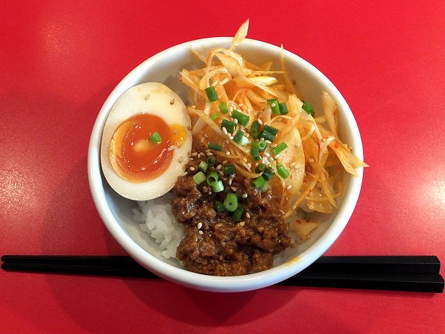 こちらは、一緒にいただいたもの。そぼろに味玉、そして辛ねぎといったと、どれも白米にとっても合うラーメンの具が載っているので、これは鉄板級の味かと。また、ライスと辛ねぎをちょっとだけ残しておいて前述のラーメンに投入したところ、これもまた。