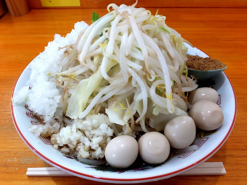 こちらは、昨年10月に宇都宮にオープンした、いわゆる二郎インスパイア系(個人的にはこの呼び方はあまり好きじゃなかったりしますが…。)のお店。で、今回初めてお伺いしたのですが、平日にもかかわらず、開店待ちで軽く行列が出来るほどの人気のお店なんですね。それで入店して、早速券売機で食券を購入するのですが、基本的メニューはラーメンのみで、その麺量によって3種類(200gと300gが750円、400gが850円)。他は、トッピングメニューが豊富(豚2枚が200円、うずら・魚粉・粉チーズが各100円、たまねぎ・生卵が各50円。)でした。