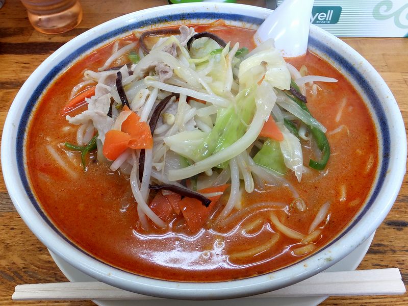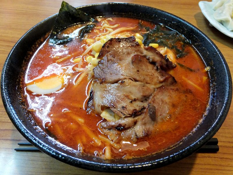 ですが、私がいただいたのは「おすすめ」と書かれたこちら。ちなみに辛さはマイルド~3倍まで(2倍以上は有料)で選べるのですが、今回はいきなり3倍にチャレンジしてみました。それでまずはなかなか凶悪な見た目のスープからいくと、辛さは何とか味わっていただける範囲。(この、辛いものを初めていただく時の「大丈夫かな」というドキドキ感って、個人的に好きだったりします。)で、その辛味以外の味が結構個性的で、全体的にかなり濃いめの味付けに感じたのですが、一番強く感じたのが味噌からと思われる寝かせたような、ひねた熟成味。今回は辛し味噌にしましたが、通常の味噌ラーメンだとどういう味になるのかも気になりますね。そして麺は、やや平べったい中太縮れ麺。どちらかというとモチモチとした食感で、濃いスープと合っています。あと具は、炙りの入ったホロトロの大きなチャーシューの他、キャベツやモヤシどのヤサイが結構たっぷり。そして、半個分入る味玉が色々と濃い中で息抜きになっています。