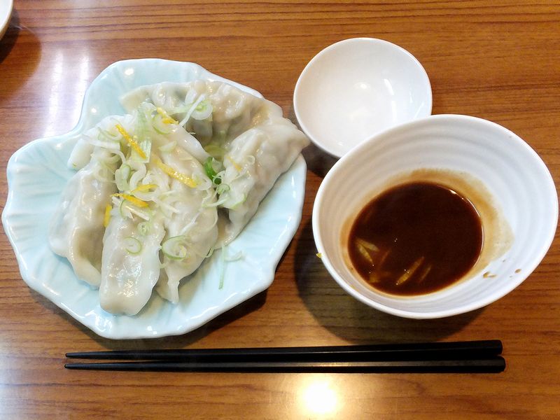 こちらは、一緒にいただいたもの。茹で餃子をこちらのお店のつけ麺のタレでいただくという品なのですが、これがなかなかというか。餃子自体もしっかりとした豚肉(とニラ)の味が感じられ、もちろん、お酢とラー油だけでもイケる(こちらから特に言わなくても別にそれ用の小皿を出していただきました。)のですが、このつけダレがまた良いというか、濃厚魚介豚骨の付け汁に浸けることによって、味に深みと個性を付加するというか。更にそこに、付け汁、そして餃子の上にも散らされた柚子の皮が、何とも素晴らしいアクセントになっているというか、そのままだと重く感じる付け汁に丁度良い清涼感を与えているように感じました。