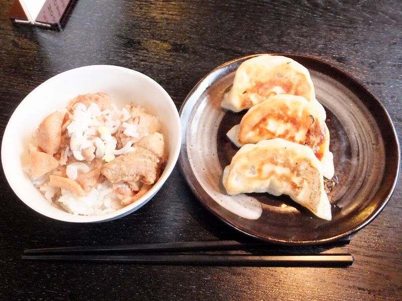 こちらは、一緒にいただいたもの。もつ煮丼小と餃子のセットになっています。餃子は前回もいただいたのですが、相変わらずジューシーで美味。そしてもつ煮丼ですが、モツはとても柔らかく、味付けは味噌ベースで甘さ控えめな感じ。また、必要上に濃すぎないのも良いですね。(個人的には、丼も良いですが単体で酒が欲しいです。)