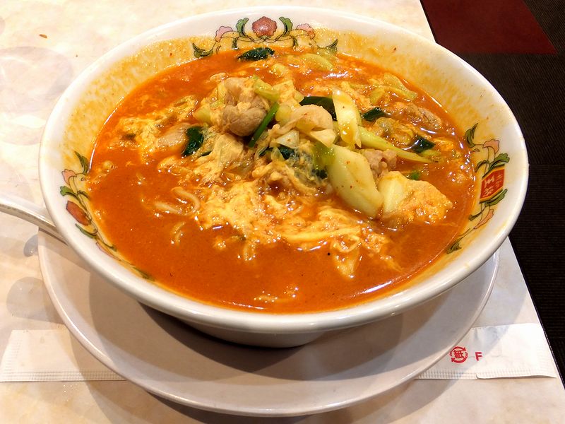 こちらは、私が〆でいただいたもの。壁に貼ってあったポスターだとスープは真っ赤になっていましたが、こちらの実物はオレンジ色とややマイルドな感じ。もっとも、辛さは色じゃわかりませんが、実際にいただいてみても見た目同様それ程辛味は強くなく、個人的ピリ辛程度に感じました。で、その唐辛子の程良い刺激と共にコクのある味が口に広がり、これがなかなか。ベースのスープが何か気になりますね。(少なくとも、アッサリ系ではないような…。)また麺は、細目でウェーブがかったツルツル且つややプラスティッキーな食感のもの。そして具は、豚肉とニラ、ふわふわ卵の他、キャベツが結構入っていました。それにしても、このようなちょっと凝ったラーメンが1杯399円とは、何とも驚異的なお値段という気がします。