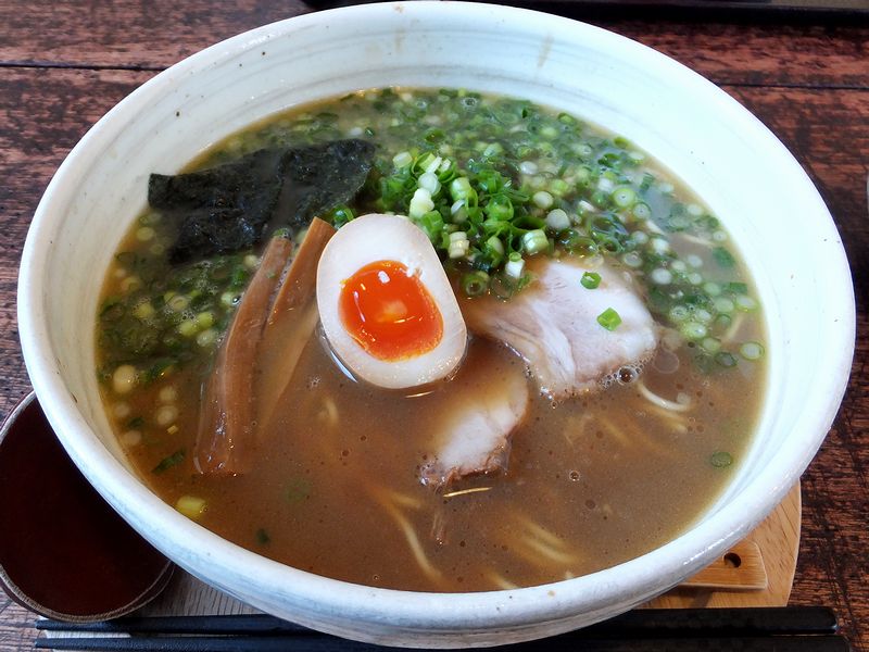 そこでいただいたのが、こちら。じつは、入口のところの券売機で「人気No.1」と書かれた「のり玉ラーメン」の食券を買った筈だったのですが、出てきたのは上にネギがトッピングされていたというか。でも、店員さんから直ぐにかつ丁寧に謝っていただいたので全然問題ないというか、むしろ、トッピングをオマケして貰った感があり逆に恐縮するというか。それでまずはスープからいただけば、のっけからかなりコッテリとした豚骨醤油がグワっと。こちらのお店って、いわゆる「家系」とは謳ってはいないのですが、印象としてはそれに近いというか。(こころなしか「豚」のダシが強い感じもしますが。)なので、卓上のニンニクとの相性は言わずもがな。途中から投入すれば、更に旨さが際立つというか。そして麺は、手もみによる捻れの入った、やや平べったい中太のもの。モチモチした食感が濃厚なスープと良く合いますね。そして具のチャーシューは、スモークされたもも肉と低温調理されたロースの2種類が入っているとのことですが、確かに片方はスモーキーな風味が香ばしく、また片方は柔らかくも歯応えを残した食感が良かったような気が。あと、味玉の味加減や黄身の具合も良い感じだし、海苔は相性抜群だし、多めのほうれん草も嬉しいし。更にはトッピングのネギも、辛味が良い感じでアクセントになっていました。