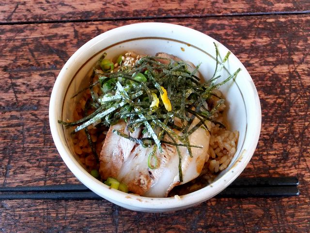 こちらは一緒にいただいたもの。それで、入口のところに置いてあるメニューボードには「屋台風まぜごはん」と書いてあったのですが、見た目はわりと黒々としているのに、これがまた良い塩梅だったというか。また具のチャーシューは、上に載っているもの以外にも細かいのが炒りゴマと共にご飯に混ぜられていて、そこに天盛りの海苔と青葱、そして柚のアクセントが加われば、もう。これはまたいただきたくなるサイドメニューでした。