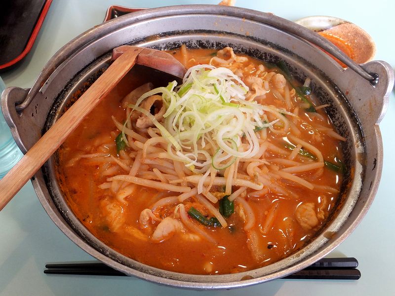 それでこちらのお店は氏家の本店もそうですが、品数がやたらとあって、中でも個人的にはみそラーメンとかタンメン、あとは担々麺やニラレバ定食なんかがお気に入りなのですが、今回いただいたのはまだレギュラーメニューになっていないっぽいこちら。(何かここ最近、味噌味ばかりいただいている気もしますが…。)それで待つこと暫しで登場したのですが、お品書きの写真より具だくさんなのが嬉しいのですね。で、まずはスープを一口いただけば、「うん。味噌チゲ。」っていうか、チゲって表現に困るというか、辛くて旨味が濃くてというのはどれも共通するイメージなのですが、その先の細かい表現が思い付かないというか…。あ、でも、具にモツとキムチを使っているので、スープにそれらの風味は十分出ています。そして麺は、登竜オリジナルの長方形断面な縮れ麺。適度にコシがあって、モニュモニュした食感というか。また具は、メインのモツは柔らかくて良いですね。それと自家製で販売もしているキムチも良い感じ。あと、モヤシなどの野菜が、見た目どおりボリューミーでした。