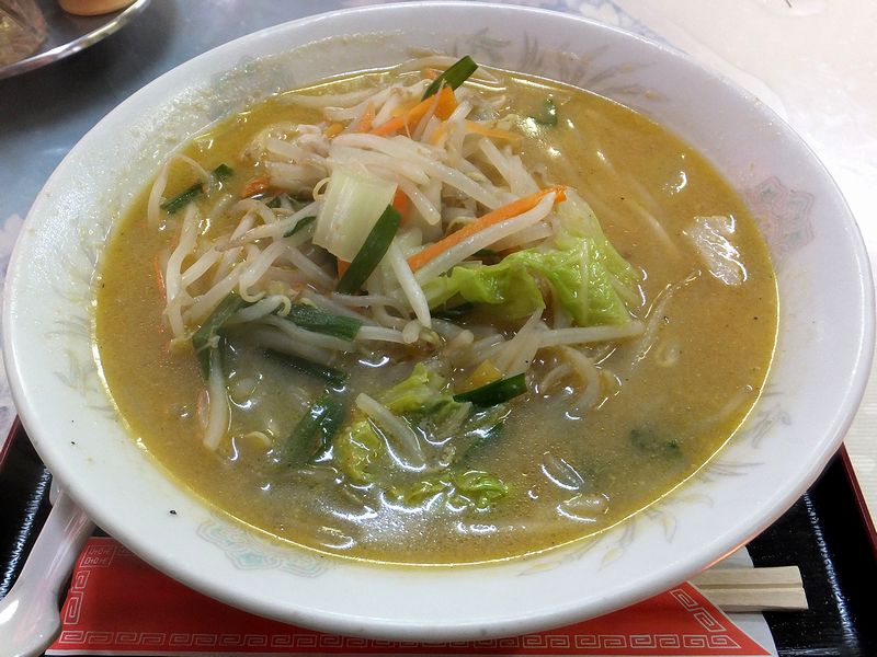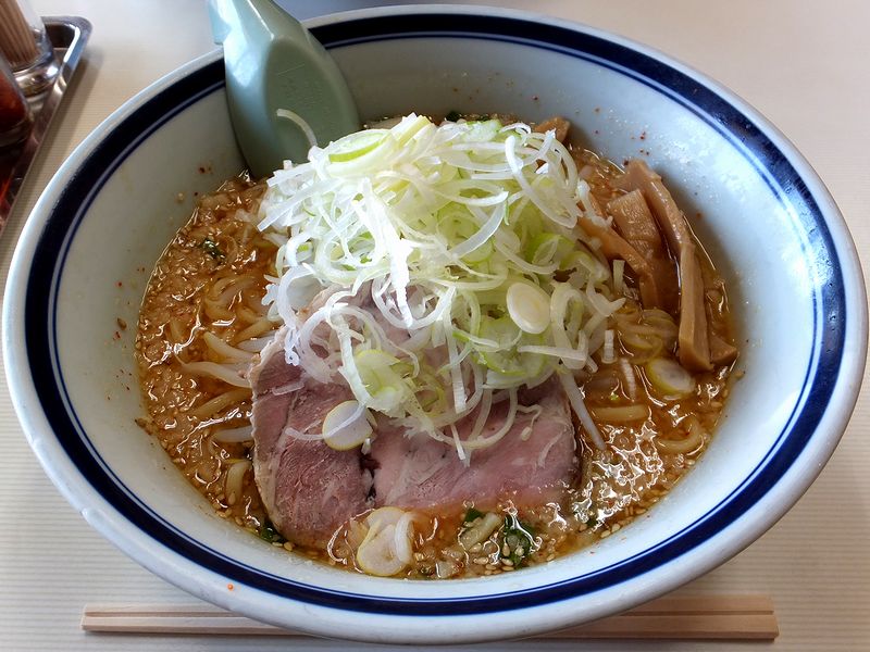 だからというわけではないのですが、今回いただいたのはこちらの品。お店の入口のところに「みそラーメン」って大書きされているので、実は最初に来た時も気になっていたんですよね。で、そのみそラーメン。スープを一口飲んだだけで、口の中がホっとするというか。作り方的には昔ながらの野菜炒め煮系だと思うのですが、たっぷり入った野菜のお陰か、はたまた、使われている味噌ダレのお陰か、角のない、何とも丸い味になっています。また麺は、若干柔らかめというか、ポニョっとした食感の中太麺で、これも優しいスープと同じ印象というか、良く合っているんじゃないでしょうか。