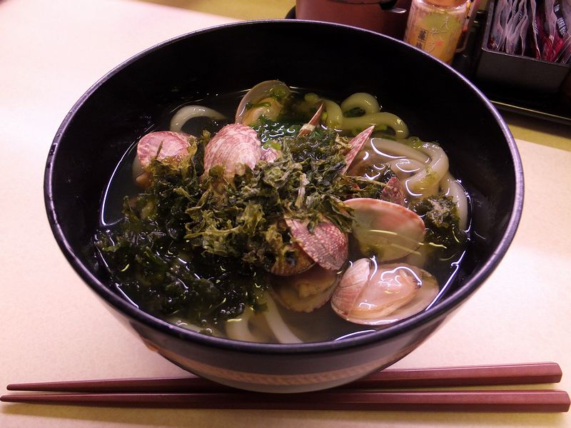 で、いただいたのがこちらのうどん。見た目も味も、塩?味のあさり汁にうどんが入り、上にアオサが掛かっているという感じでしょうか。量的にはミニサイズですが、値段を考えると味は悪くはなかったというか。