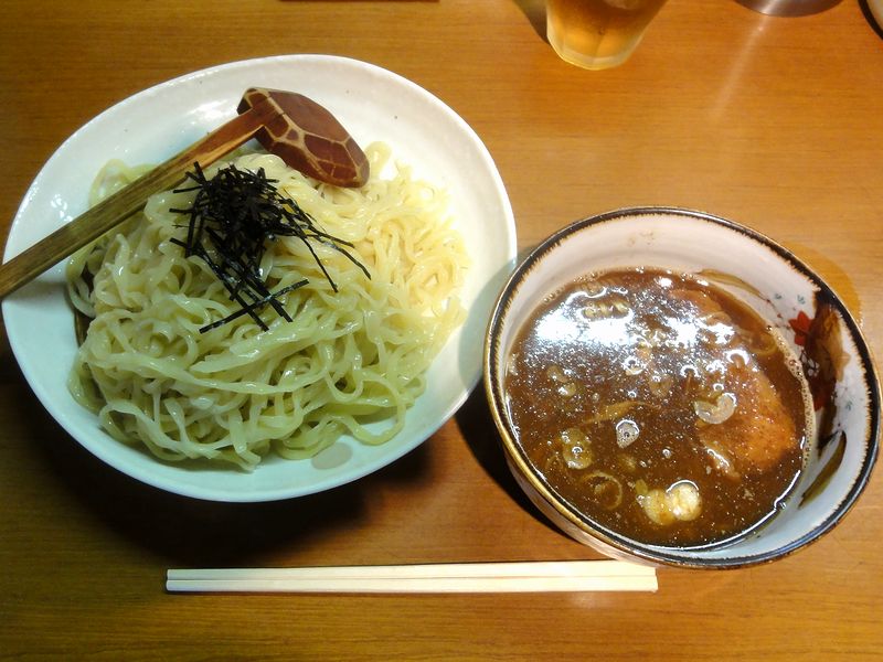 それで注文の際、105円違いで麺量が3種類(180g、270g、360)あるうち、一番小さいのをお願いしようとしたけど上手く伝わらなかったようで真ん中のサイズとなってしまったのですが、その麺が、こちらのメインの濃厚(と、あっさり)つけ麺の極太麺とは違う、中くらいの太さのものになっているんですね。また付け汁も、こちらの標準の石製ではなくふつうの器に入っています。で、早速麺を付け汁に浸けていただけば、これがまた濃厚。こちらのつけ麺は「濃厚」でも「あっさり」でも旨味がとても濃いのですが、こちらは更にそれに、煮干しの味と香りをストレートかつストロングに付加したというか。これはこれで旨いと思います。また麺は、前述のとおりの太さなのですが、確かに、この付け汁にはアリというか。(デフォルトの極太麺でもねそれはそれでいただいてみたいですけど。)そして具は、チャーシューとメンマが付け汁の中に入っていました。