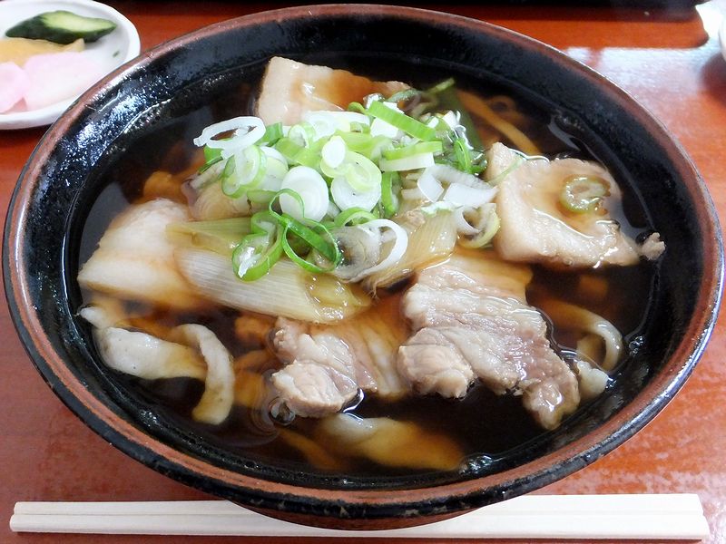 そこでいただいたのがこちら。お品書きを見ると結構な品数で正直かなり迷ったのですが、一通り見た中でピンと来たもので。で、まずはつゆですが、黒々とした見た目どおり、出汁感もそれなりにあるものの、甘さ控えめで濃い口醤油がガシっと立った東日本テイスト。そこに豚肉とトロトロに煮たネギの旨味が加わってこれが何とも良い感じというか。そしてこちらの最大の特徴が、太いというか幅広の蕎麦。それ故に啜り込むというより噛みしだくような食べ方となるのですが、ムチっモチっとした食感と、その後そばの風味が口の中に広がるという、なんとも素朴な感じがとても良いですね。そして具は、前述の豚肉とネギなのですが、これが素朴な蕎麦と非常に良く合っているというか。