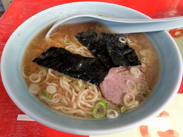 そんなわけで、フェリーターミナルからまっすぐ向かったのがこちらのお店。フェリーの入港時刻は午前7時半の筈だったのですが、下船に手間取りフェリーから出るのに30分程掛かってしまったので、お店に着いたのは午前8時をだいぶ回った頃になったのですが、なんと、この時間でも、ラーショの中ではわりと広いと思われる店内は満席。なので、店外のテラス席みたいなところで相席となりました。そしてその後も続々とお客さんがやってきたのですが、元々店内にいたお客さんを含め、何故か中年男女の二人連れが多いんですよね。(もっとも、我々もそうなのですが。)