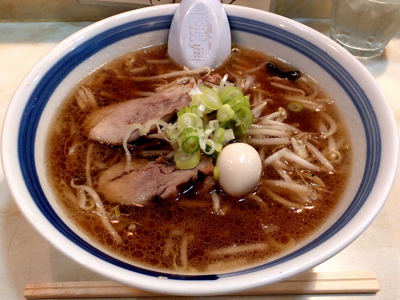 こちらはお店の名前のとおり、函館において札幌ラーメンという看板を掲げ、函館といえばの塩ラーメンの他、味噌ラーメンも評判のお店らしいのですが、お願いしたのは何故かこの正油ラーメン。で、まずはスープからいただくと、アッサリとした動物系主体のベースに、炒め野菜の旨味とコク、そして醤油がキリっと効かせた、これがなかなかのバランスというか。また、スープに入ったモヤシなどの野菜類も、シャキっとした噛み応えが絶妙な火の通し加減。そしてそこに、わりとクラシカルな風味の麺が合わさると、これがまたもう。さらに、2切れ載るチャーシューは味と食感どちらも良い感じだし、個人的には、真ん中へんにちょこんと載った鶉の卵がツボだったりして。