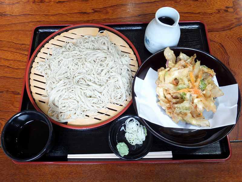 こちらは、盛りそばの量が最低でもこの二合から。以前その上の三合もいったことがあるのですが、今回はおとなしくこちらで。あと、かき揚げも一緒に頼んだのですが、結構人気というか男性は三合+かき揚げという組み合わせで頼む方が多いような気がしました。で、ちょっとだけ待って登場した蕎麦ですが、他のお店だと「大盛り」でも通じる量ですね。それで太さは細めで結構コシが強い感じ。そして何より、香りが良いじゃありませんか。入口のところに「夏新そば入荷しました」と貼り紙がしてあったのですが、秋新に比べて味や香りが劣るなんて言われる夏新も、なかなかどうして、充分美味しいですね。それとつゆは、結構味が濃いというか塩気強め。相方は「甘い(甘みが強い)」と申しておりましたが、個人的にはあまり甘くなく感じました。(その辺は味覚の違い故かと。)あと一緒にいただいたかき揚げは、結構なボリューム。タマネギなどの野菜がメインで、サっクサクというよりは表面カリっと中はホクホクという、なんとも素朴な感じでした。