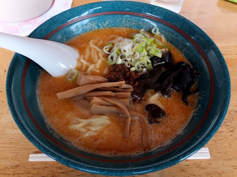 いただいたのは、お店を調べた時に某栃ナビなどの口コミによく名前が挙がっていたこちら。練りゴマとラー油が混ざったような色をしたスープは、ゴマのコクが豊か。っていうか、ベースとなっているスープのアッサリさ加減が、ゴマの味を引き立てているような気がします。また、上手く言えないのですが、旨味や風味的にもちょっとひとひねりあるような気が。とりあえず最後の方になって、干しエビが関係しているのはわかりましたが。それと辛味は穏やかというか、ちょっとピリっとするくらいなので、辛党の方は卓上のラー油追加投入で。あと麺は、チュルっとした啜り心地にモチッとした食感を併せ持つ、やや平たい感じの中太麺。自家製麺なんでしょうか?それにしても、担担麺でも通じそうな一品なのにあえて「ごま辛ラーメン」と名付けたところにも、店主さんの拘りを感じるというか。