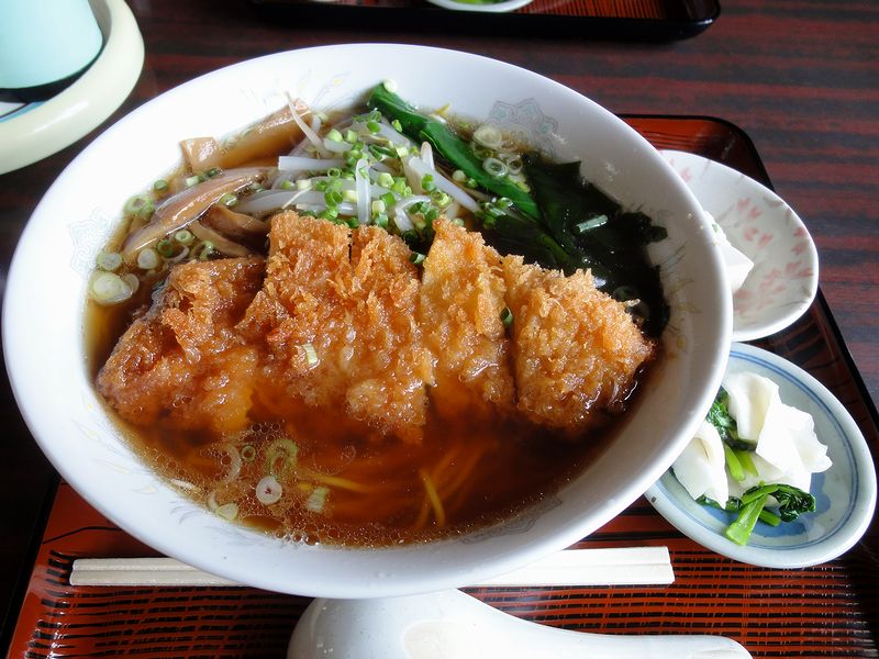 そんな中いただいたのが、お品書きでラーメン系の最上段に書かれていたこちら。トンカツ+ラーメンという、ちょっとレトロチックな組み合わせが何ともツボなのですが、まずはスープを一口啜ると、これが意外といったら失礼ですが、魚系の出汁が効いたしっかりとした物。麺はちょっと懐かしい感じの中華麺で、このスープに良く合っています。そして具は、揚げたて熱々のトンカツが。また衣の一部はサクっとした食感が残っていました。他には、栃木の醤油ラーメンでは珍しい茹でモヤシが、トンカツの油と合っているというか、さっぱりさせてくれるような。それと、お新香と冷や奴が付いているのが嬉しいです。
