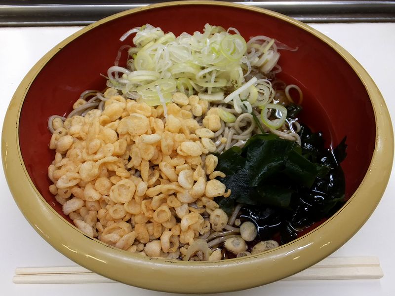 それで今回は、夏季限定のこちらを。つゆは仕様が変わってから甘みが強くなったと思ったのですが、冷したぬき故濃いせいか冷たいせいか甘みが抑えめに感じられました。蕎麦はゆで麺ですが、冷やしたので歯応えは増しているかと。そして具の揚げ玉は既製品なのですが、冷たいと馴染まないというか、つゆにコクを与えるというより、クリスプ感と香ばしさを加えるという感じで。あと、ワサビが添えられていなかったのは忘れられたんですかね。もっとも、七味でも個人的にはあまり問題はないのですが。